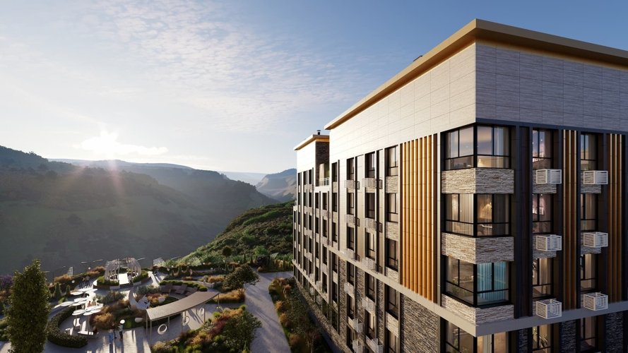 Архитектура квартала выдержана в природных тонах — беж, терракот, дикий камень, золотистые ламели. Пять шестиэтажных домов гармонично вписаны в горный ландшафт, создавая атмосферу альпийского курорта.